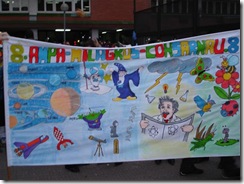 Y llegaron los carnavales, con sus coloridos, su música, su gente y su CUCHIPANDI !..... nos disfrazamos....., bueno intentamos ser el Universo con sus estrellas, su luna, su sol, sus nubes... ya sabéis todo eso que esta por encima nuestro, aparte de las hipotecas claro está. Salimos en la Rua oficial por la Cl. de Santa Eulalia desde la plaza de la Pinza y llegamos hasta el Gasómetro. Allí esperamos a que fueran llegando todas las comparsas y que repartieran los premios.! SORPRESA ¡ ganamos el 4º premio, bueno nosotros no, el cole, que quede claro y fue para la mejor pancarta realizada.